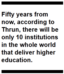 UPDATE (5/31/2012) “The Future of Undergraduate Teaching” is a view of how undergraduate teaching may look in a world of online education. Online lecturers with support staff and peer-to-peer learning in early coursework. Live lectures are a rarity, while small group learning becomes the norm.